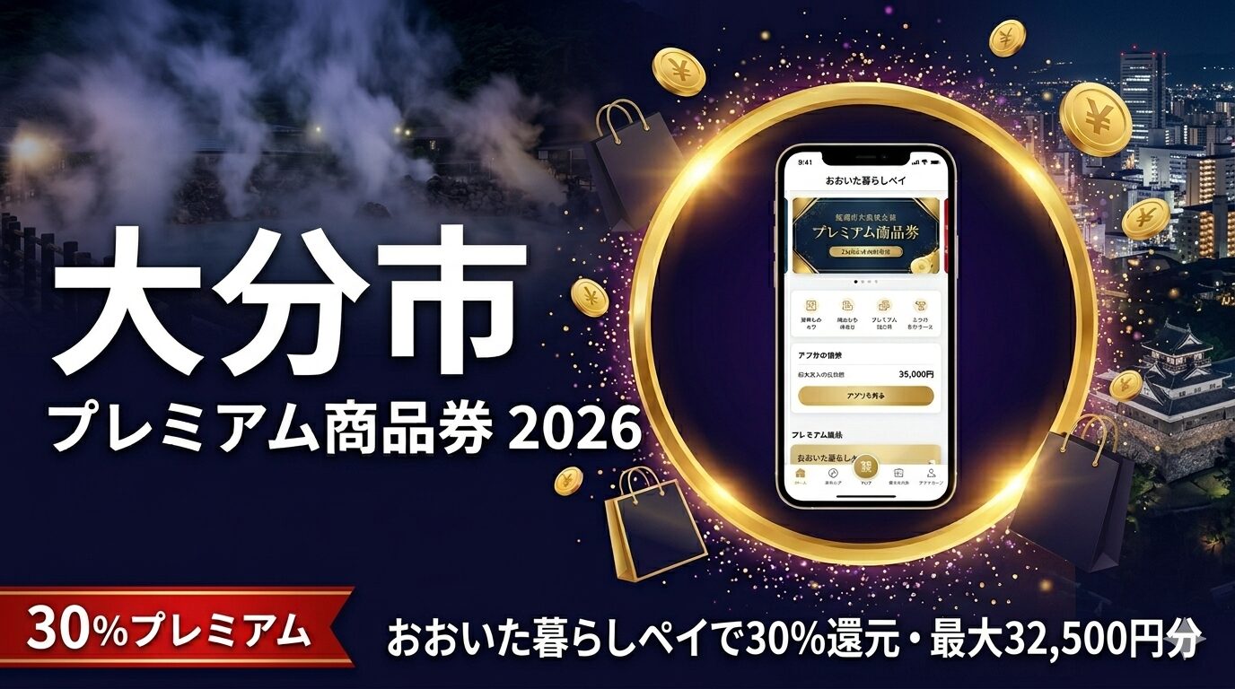 「大分市の商品券って何?」「おおいた暮らしペイってどう使うの?」「30%ってどれくらいお得なの?」——そんな疑問をお持ちのあなたへ。この記事では大分市プレミアム付電子商品券2026の全情報をわかりやすくまとめました。