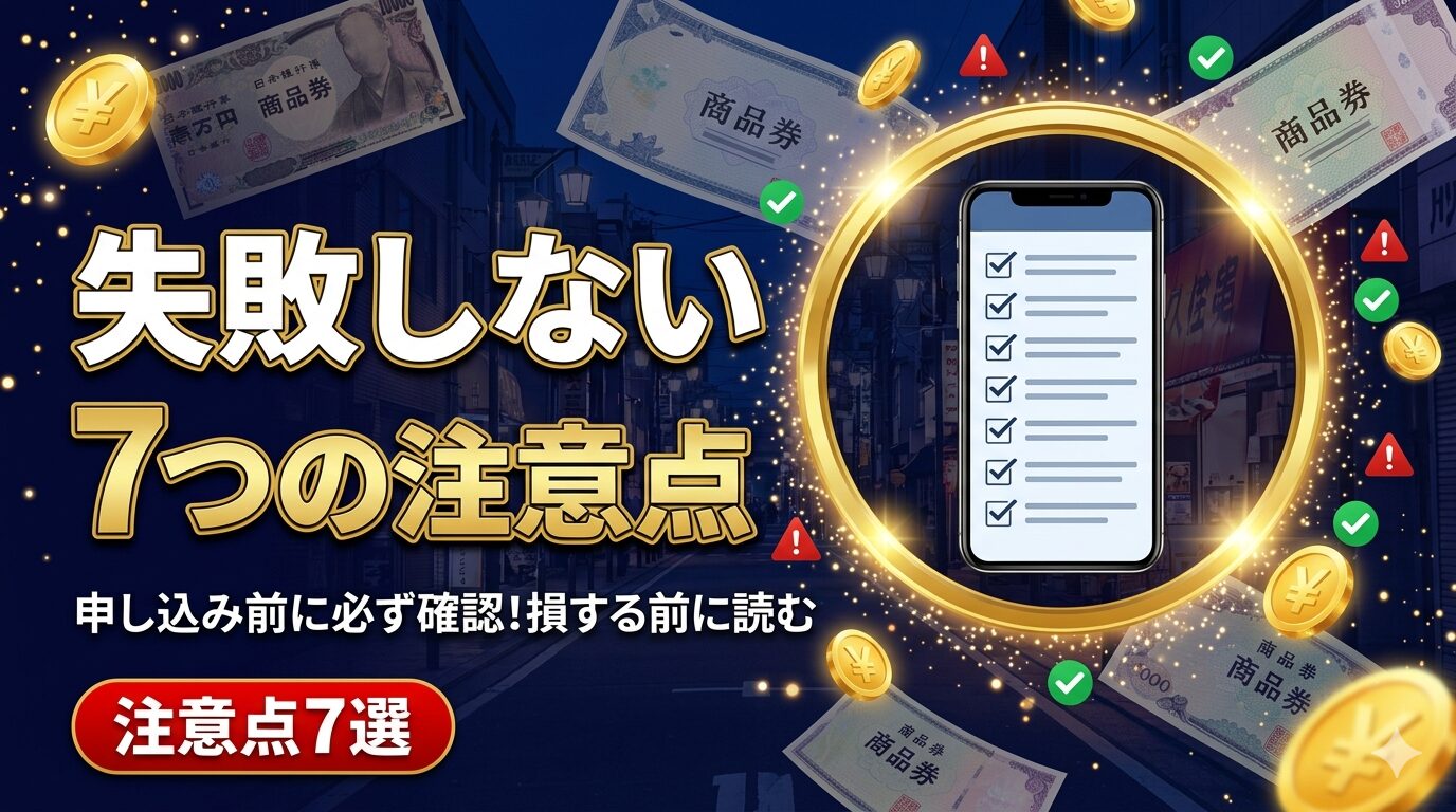 プレミアム商品券は最大20〜25%のプレミアム(上乗せ)がつく超お得な制度ですが、知らないと損する落とし穴もあります。この記事では失敗しないための注意点7つをわかりやすく解説します。